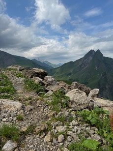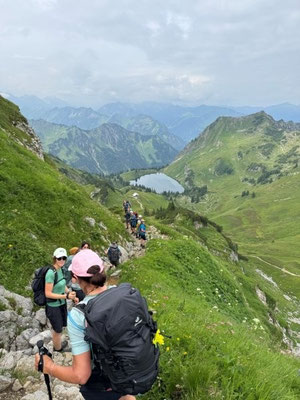 Schon die Auffahrt mit der Nebelhornbahn bot grandiose Ausblicke auf die umliegenden Gipfel. Oben ging es über das Laufbacher Eck, einen der schönsten Panoramawege der Allgäuer Alpen. Schmale